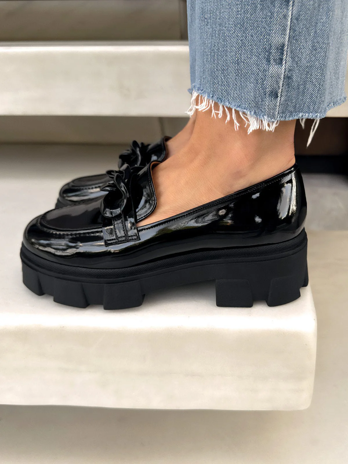 Elevate your style with Imogen Black Gloss Leather Loafers featuring a stylish black chain detail. These high-quality loafers are perfect for various occasions.