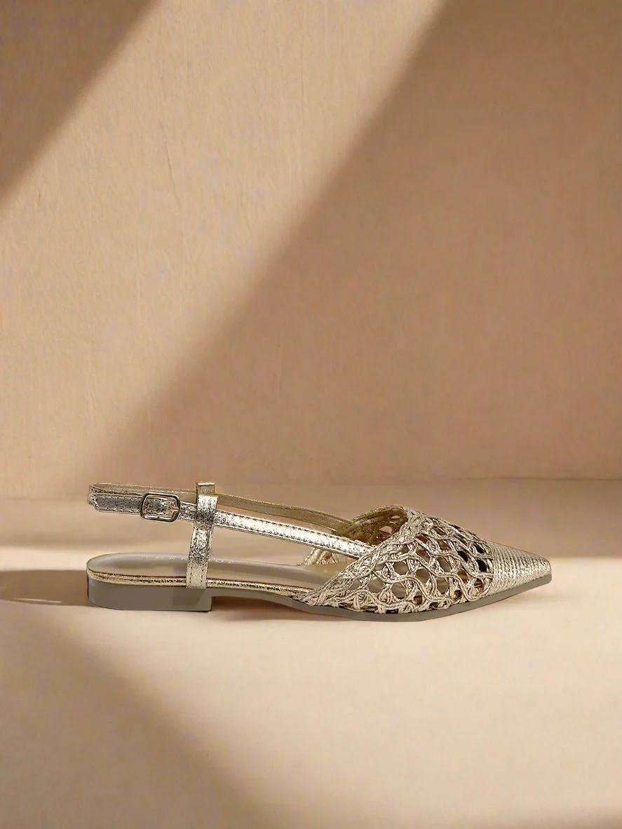 Bring a touch of elegance to your summer look with these bronze slingback flats, designed with an intricate woven pattern and a chic pointed toe. Lightweight and breathable, they combine refined detail with everyday comfort—ideal for warm-weather dressing that’s both graceful and effortless.