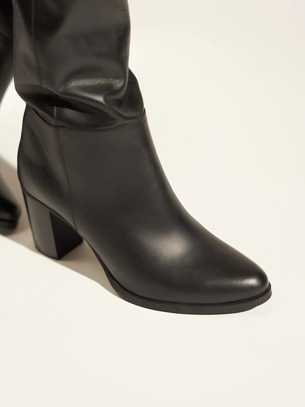 The Phoebe boots have a slouchy, scrunchable shape that'll work just as well over skinny pants as under a midi dress. They've been made from soft leather and grounded on 65mm block heels. Calf circumference ~40cm. Height measured from heel ~48cm.