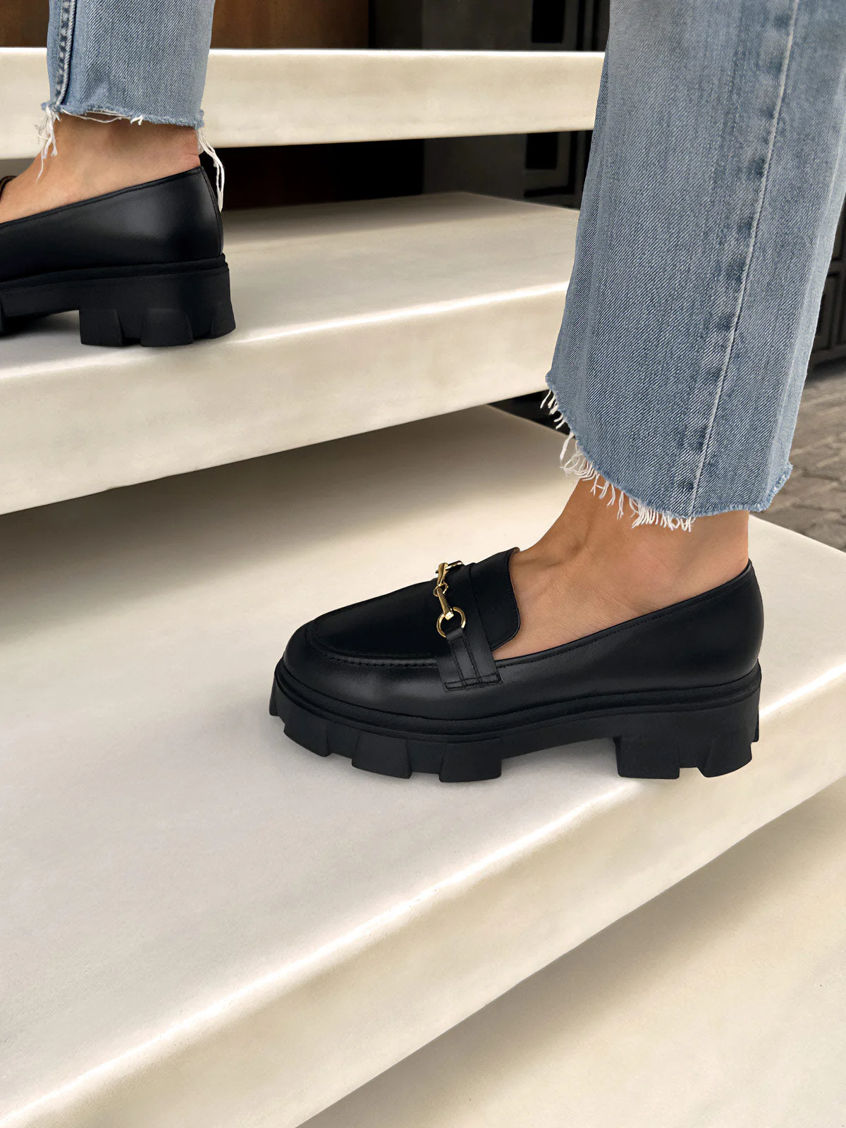 Stride with confidence in the Viola Black Loafers, a modern take on classic footwear. These loafers feature a bold chunky sole and a mat black leather upper, accented with a chic gold-tone chain across the vamp. Perfect for adding a touch of sophistication to any casual ensemble or dressing up your workwear. Their comfortable fit and durable construction make them suitable for all-day wear.